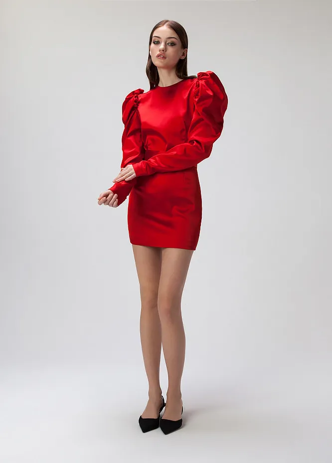 Красный — идеальный цвет на праздник. Глубокий, рубиновый оттенок в паре с гладким, блестящим материалом создает стильное, благородное сочетание. Все внимание в образе приходится на плечи — выделить их помогают объемные рукава. Несмотря на явный акцент на верх, нижняя часть тоже не останется незамеченной — смелая длина юбки позволит во всей красе продемонстрировать ноги.