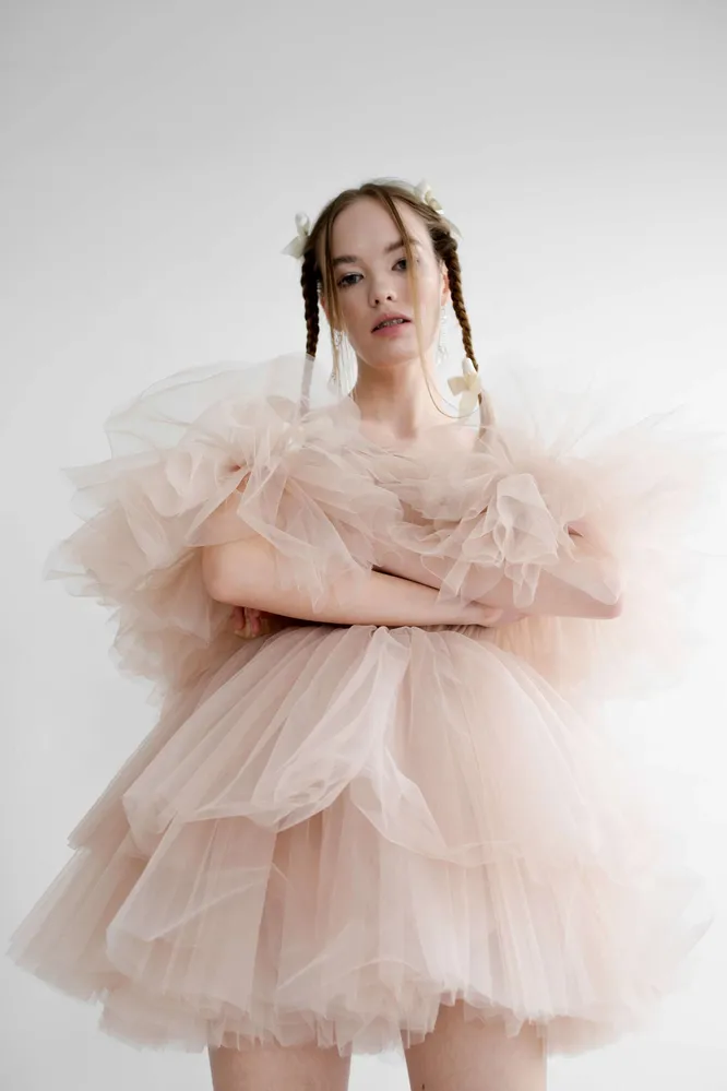 Если тебе хочется легкости и воздушности, выбирай платье из фатина. Корсетный перед компенсирует объем ткани, а также акцентирует линию талии. Бретели с фактурными оборками можно носить двумя способами — на плечах или в спущенном варианте. Во втором случае образ получится еще более чувственным. Пышность оборок легко отрегулировать, что позволит тебе подобрать комфортный для себя объем. Главный акцент в образе приходится на ноги — в таком наряде у тебя точно будет возможность их продемонстрировать.