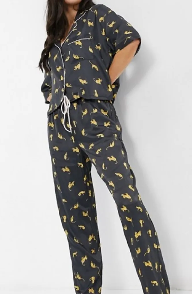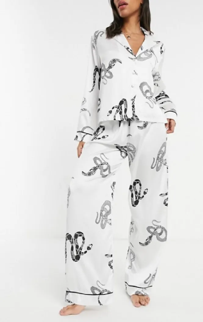 Если ты ищешь комплект, в котором можно выйти в люди, обрати внимание на модели, которые напоминают атласные костюмы в пижамном стиле. Эта шелковая брючная пижама соответствует сразу нескольким актуальным трендам: тут и широкие брюки, и модный змеиный принт, и укороченный жакет, и графичное сочетание черного с белым. Добавь ярких аксессуаров – и многие даже не поймут, что это пижамный комплект.