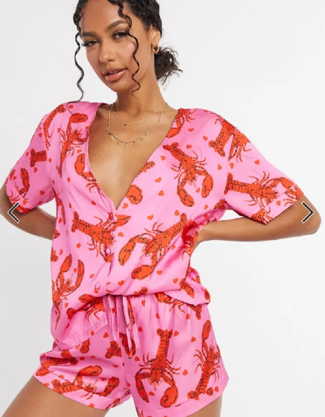 Розовый и ало-оранжевый – чуть ли не самый модный цветовой дуэт сезона, так что ты точно будешь в этой шелковой пижаме с шортами самой модной и заметной девушкой. Забавный принт наверняка поднимет тебе настроение, глубокий V-образный вырез выгодно подчеркнет то, что нужно подчеркнуть, а благодаря шнурку на талии ты можешь отрегулировать пояс шорт так, чтобы тебе было максимально комфортно.