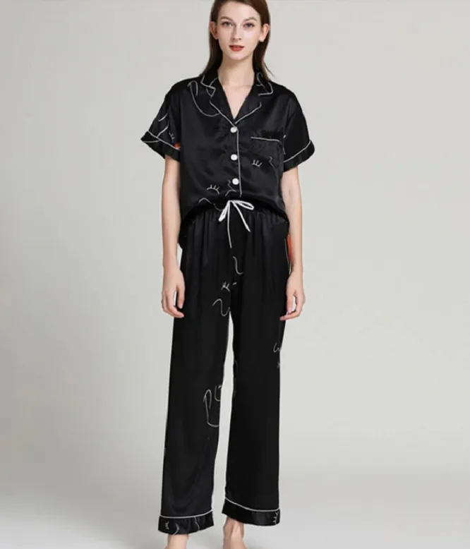 Черный цвет всегда выглядит невероятно стильно и элегантно и, чтобы ни говорили некоторые стилисты, он идет всем – и блондинкам, и брюнеткам, и шатенкам, и рыжеволосым. У него единственный недостаток: иногда его бывает слишком много, и тогда есть опасность выглядеть слишком траурно или старше своих лет. Избежать этого просто: отделка или другие цветовые акценты – и одежда сразу смотрится совершенно по-другому. Если бы эта черная шелковая пижама была однотонной, то смотрелась бы скучно – она привлекает внимание именно благодаря контрастным деталям.