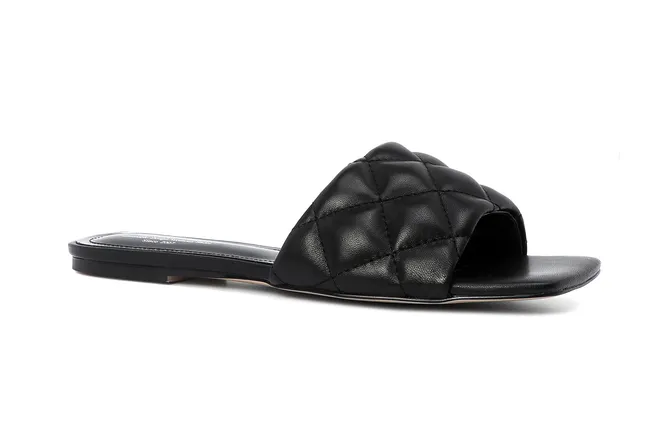 Небольшой каблучок, тонкая подошва, квадратный мыс и стеганный корпус — эти шлепанцы можно носить как днем, так и вечером. Они отлично сочетаются с повседневными нарядами и не менее гармонично смотрятся с коктейльными аутфитами.