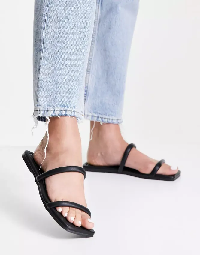 Если массивная обувь — не твой вариант, обрати внимание на эту модель шлепок. Плоская подошва с небольшим каблучком, который обеспечивает стопе правильное положение, тонкие ремешки-жгуты, квадратный мыс — смотрится такая пара одновременно дерзко и утонченно и отлично подчеркивает изящные ножки.