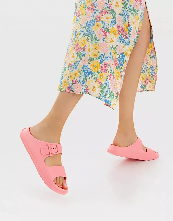 Розовые шлепанцы с широкими ремешками и толстой подошвой составят отличную пару как спортивному образу, так и наряду с ярким летним платьем. Попробуй поиграть с цветом и подбери обувь в тон ткани или одного из оттенков принта — это сделает твой лук еще более свежим и гармоничным.