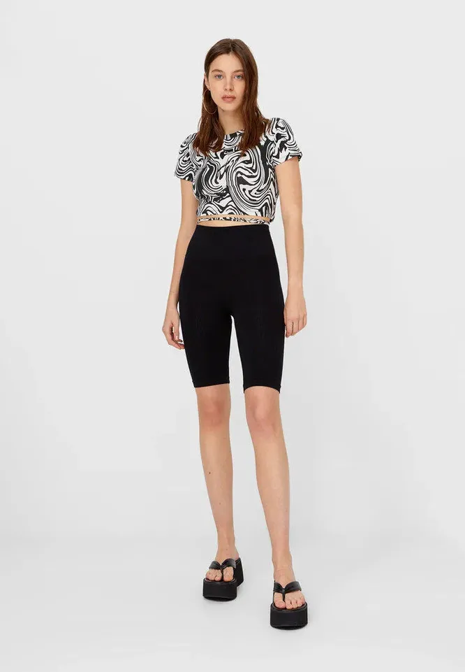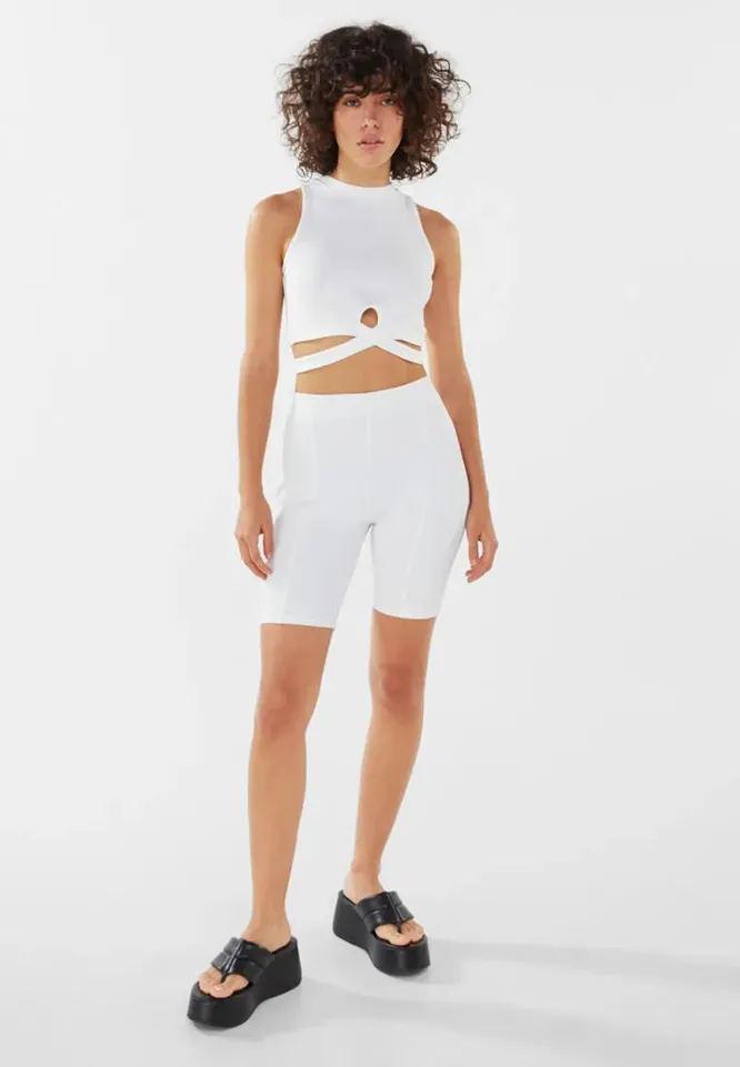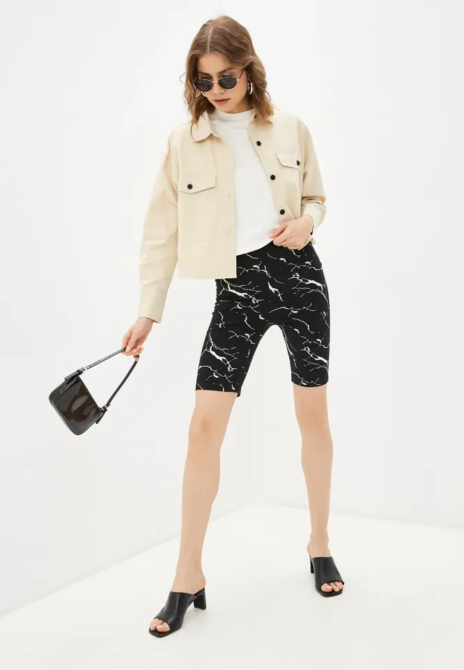 Для свидания или вечеринки смело комбинируй велосипедки со сложными топами. Пышные рукава, воланы, рюши, нежные цвета и необычные декольте будут смотреться еще более ярко на фоне спортивных шортов. Дополняй наряд босоножками с тонкими ремешками, чтобы подчеркнуть щиколотки и сделать образ изящнее.