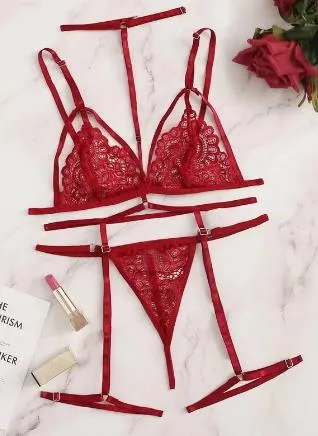Комплект нижнего белья с подвязками для чулок – это самое открытое нижнее белье. Он будет важной деталью образа, если ты не собираешься отвлекаться на то, чтобы периодически подтягивать чулки. Достоинство красного кружевного комплекта заключается в том, что даже если ты ошибешься с размером, то он все равно будет хорошо смотреться и на миниатюрной барышне, и на девушке с пышными формами. Трусики, лиф и крепления для чулок регулируются при помощи застежек. Чулки в комплект не входят. Их нужно покупать отдельно.