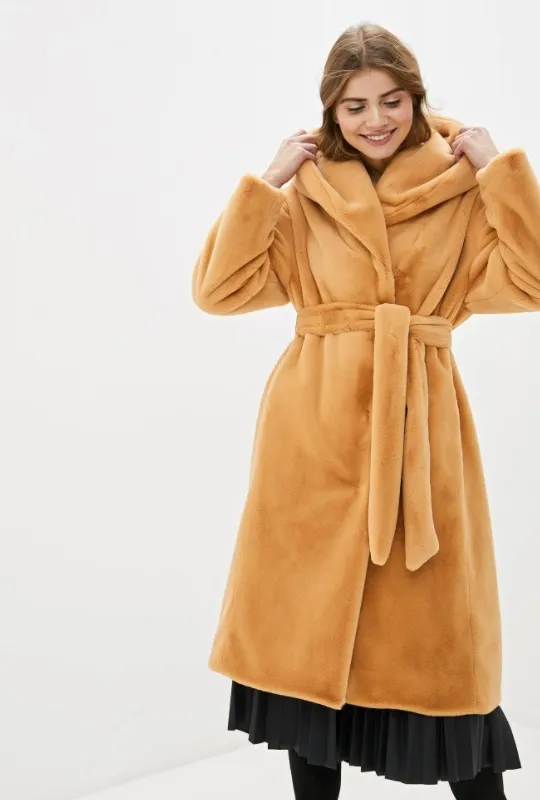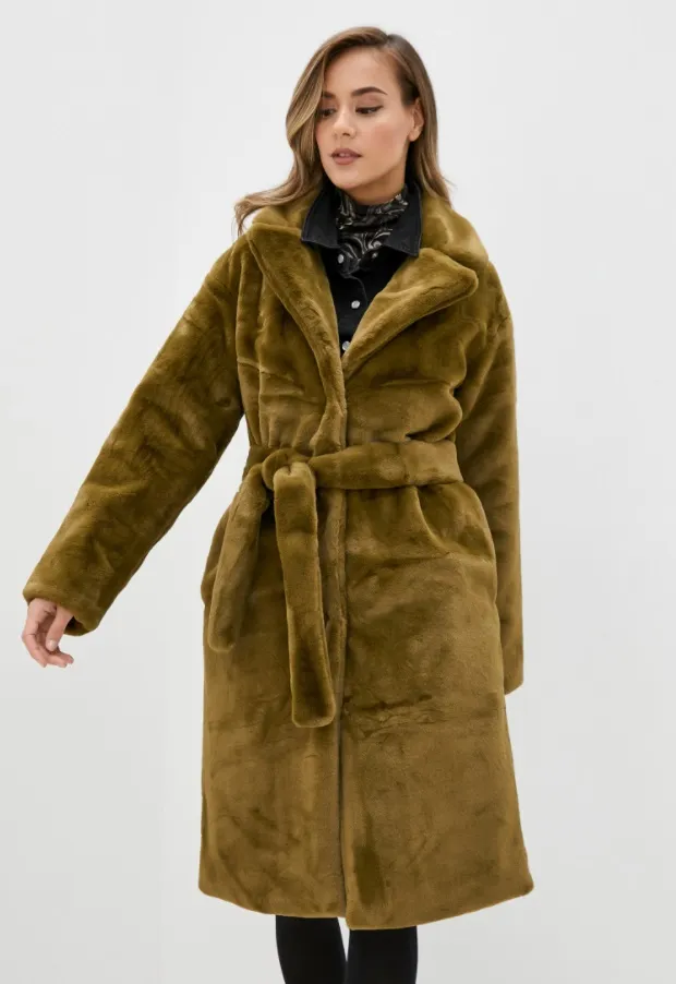 Еще одна модель с поясом, только вместо капюшона – классический английский воротник. Шуба отлично впишется как в элегантные и деловые луки, так и в расслабленные, вечерние и casual-аутфиты. На зимнюю прогулку надевай ее поверх теплого трикотажного костюма с замшевыми ботинками, в офис – с остроносыми сапогами и строгим брючным костюмом, на вечеринку – с ботфортами-чулками и трикотажным платьем в рубчик.