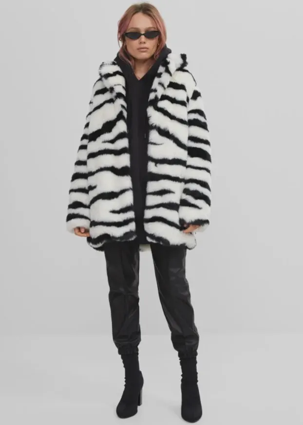 Хочется чего-то поинтереснее? Тогда обрати внимание на бело-черную шубу из экомеха. Принт «зебра» сейчас очень популярен, в такой шубе ты точно будешь в тренде. Для создания эффектного вечернего наряда надевай ее поверх платья-комбинации и дополни ансамбль остроносой парой обуви на каблуке. В повседневной жизни шуба органично смотрится и с джинсами, и с юбками любой длины, и с классическими брюками. В качестве аксессуаров добавляй длинный однотонный шарф, кожаную сумку средних размеров и кожаную панаму или берет.