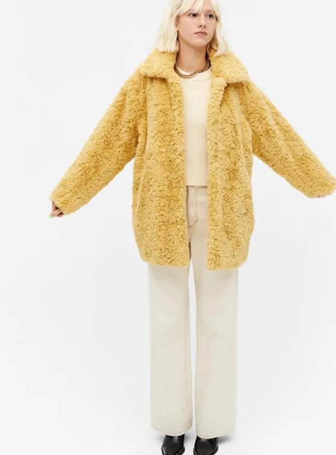 Для милых и уютных образов отлично подойдет экошуба из искусственной овечьей шерсти спокойного желтого цвета. Она круто смотрится со светлым трикотажным костюмом и теплыми аксессуарами крупной вязки. Если хочешь получить более сложный лук, носи шубу с кожаными брюками, грубыми ботинками и контрастными аксессуарами.