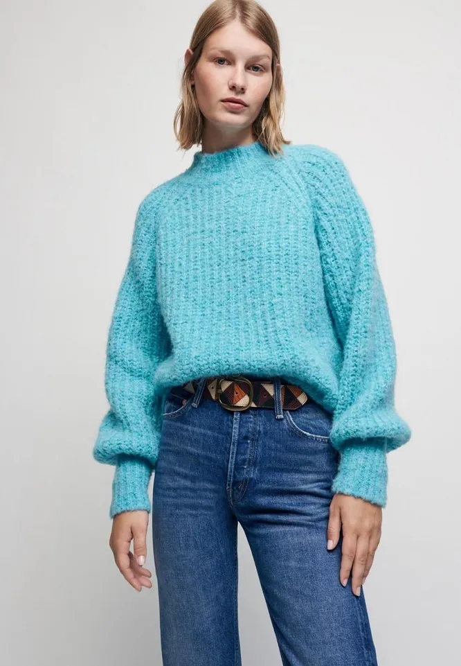 Модный голубой свитер с 50% шерсти в составе поможет освежить гардероб и вдохновит на новые стильные эксперименты. Мы бы носили его с расклешенными джинсами на высокой посадке и ботильонами на платформе. Также его можно использовать как базу под брючный костюм мужского кроя.