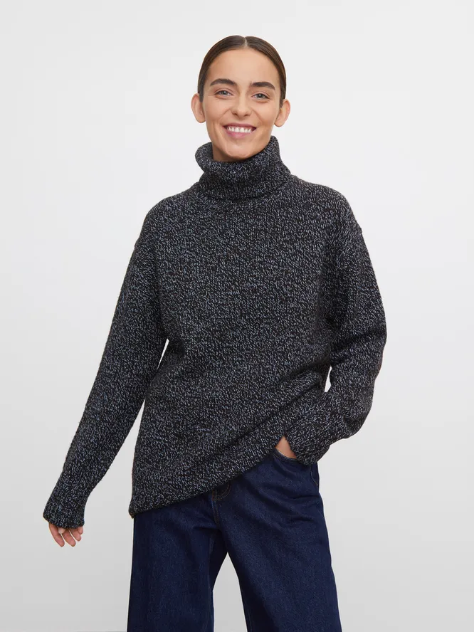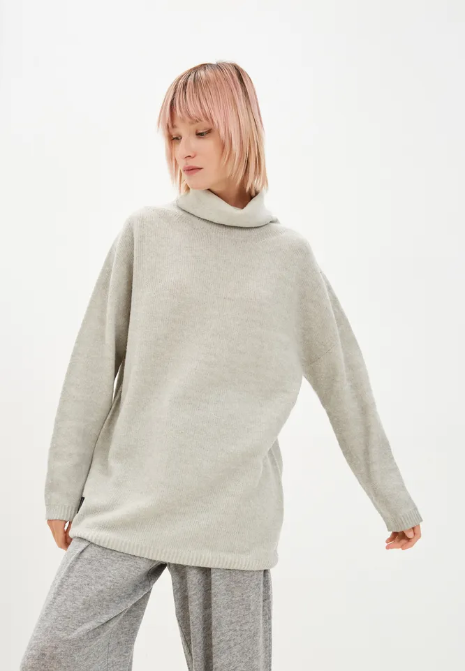 Стильный вариант на каждый день – свитер из шерсти с горлом темно-синего цвета. В составе – 63% шерсти, 20% льна и 17% хлопка. Предлагаем носить его с базовыми голубыми или черными джинсами, плотным юбками миди А-силуэта или повседневными брюками. Свитер достаточно длинный, поэтому ты можешь подвязать его кожаным ремнем, чтобы подчеркнуть талию.