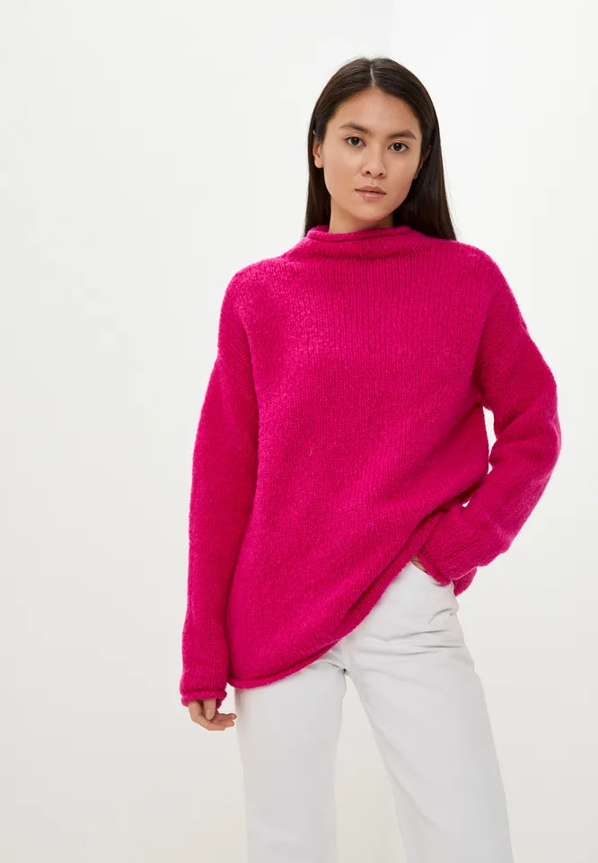 В холодное время года нашим образам порой не хватает ярких красок. Исправить ситуацию поможет яркий свитер, например, модного розового цвета. Свитер из шерсти мериноса свободного кроя с удлиненными рукавами – теплое и стильное решение на зиму. Особенно стильно он смотрится с черными кожаными брюками и высокими ботинками на шнуровке. На прогулку в парк можно надеть его с трикотажными джоггерами, замшевыми ботинками и коротким пуховиком.