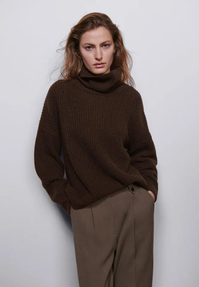 Универсальный вариант – теплый свитер из шерсти благородного коричневого цвета. Он будет круто смотреться с классическими брюками со стрелками и обувью на каблуке. Так можно пойти в офис или не выставку в музей. Более расслабленный вариант – свитер в сочетании с вязаными штанами или широкими джинсами. Если хочешь более дерзкий лук, сочетай вязаный свитер с кожаными брюками.