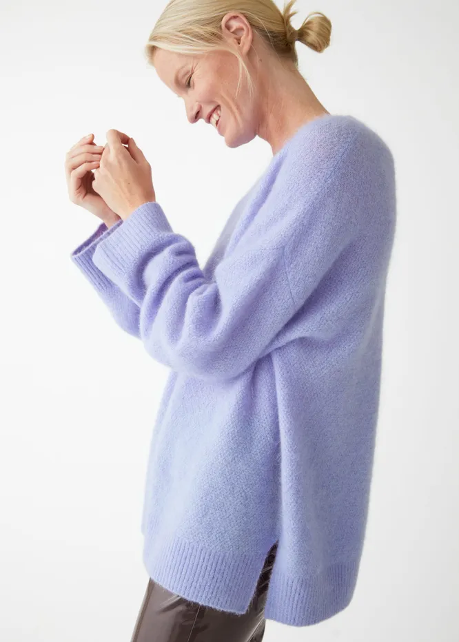 Красивый и модный свитер из натуральный шерсти сиреневого цвета преобразит твой зимний гардероб. Модель кроя оверсайз станет отличным дополнением к модным образам на холодный сезон. Например, ты можешь надеть его с плотными леггинсами и высокими сапогами. Или же замиксовать сиреневый свитер с белыми джинсами и светлыми ботинками на тракторной подошве.