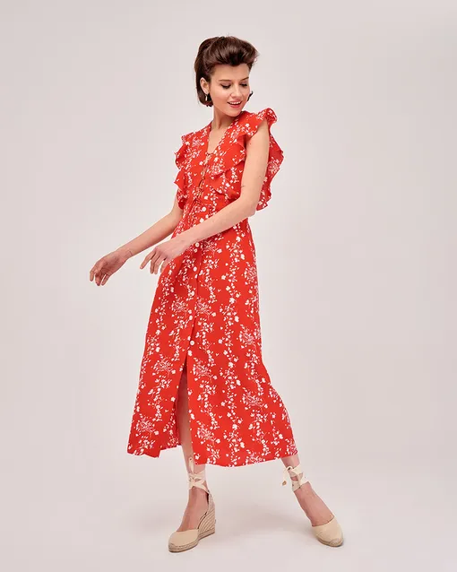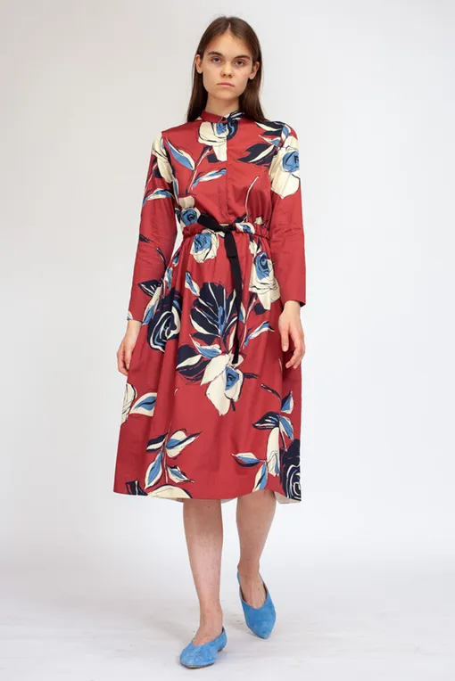 Бордовое платье на пуговицах с кулиской и принтом «Уста к устам», 6800 рублей