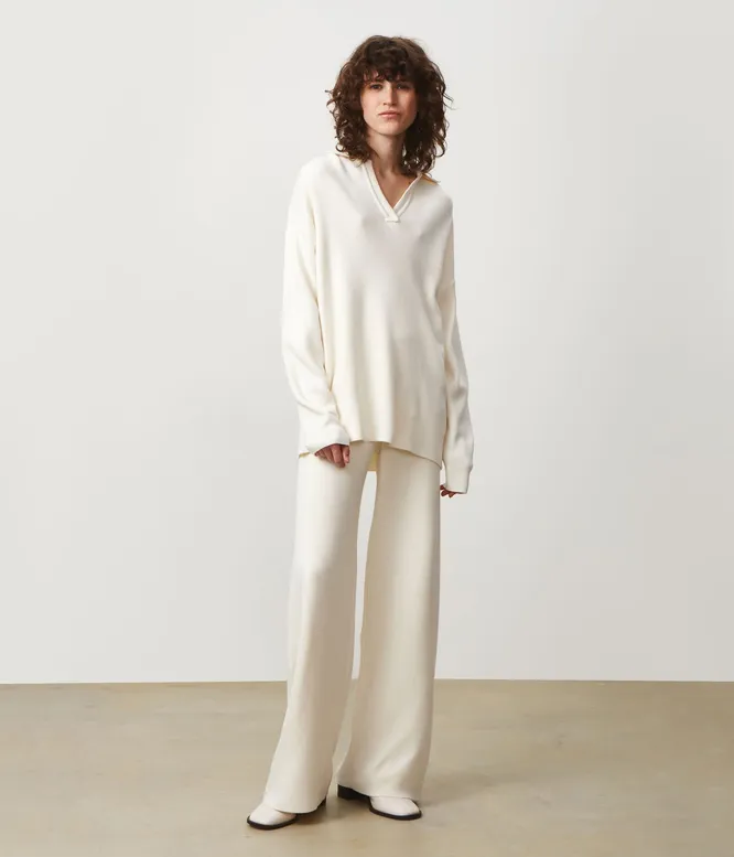 Идея номер один – трикотажные костюмы с брюками. Будь внимательна, сейчас котируются только широкие расклешенные брюки: дудочки, укороченные и обтягивающие ноги модели неактуальны! Джоггеры – можно, если они объемные. Но да, в тренде сейчас именно длинные расклешенные брюки, на них можно делать ставку.