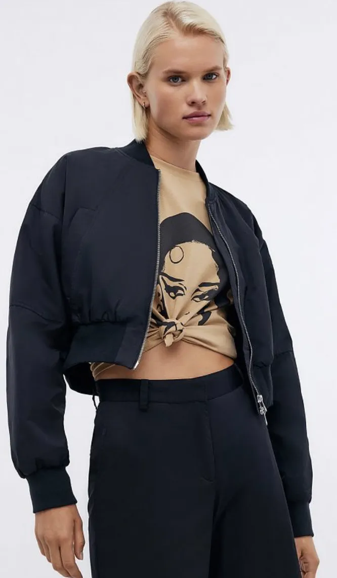 Образы с кроп-бомбером смотрятся аккуратно благодаря его силуэту. И в стилизации укороченный бомбер прост: инфлюэнсеры советуют сочетать его с брюками на завышенной талии, чтобы подчеркнуть бедра, — здесь ничего нового.