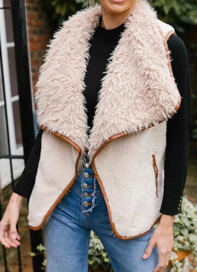 На весну и осень идеально подойдет кремовый жилет из овчины с оторочкой из кожи и большим отложным воротником. Он станет отличным дополнением к образам с жакетами, свитерами, джемперами, а также сыграет роль дополнительного слоя в луках с тренчами и легкими пальто.