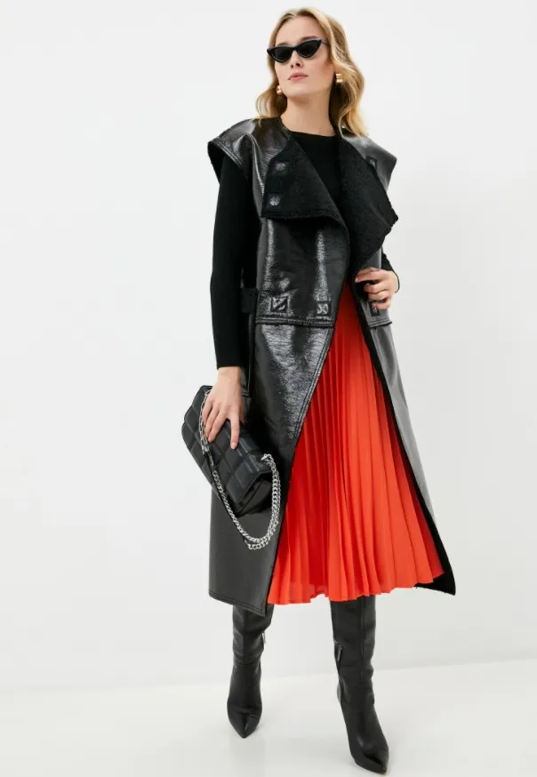 Кожа уже несколько сезонов подряд не покидает списки трендов. Одним из главных мастхэвов этого сезона стали кожаные плащи и жилетки. Мы нашли для тебя длинный кожаный жилет с подкладкой из овчины, который любому образу добавит перчинки. Его можно носить в паре с женственным трикотажным платьем макси или сочетать с дерзкими кожаными брюками и романтичной блузой в викторианском стиле.