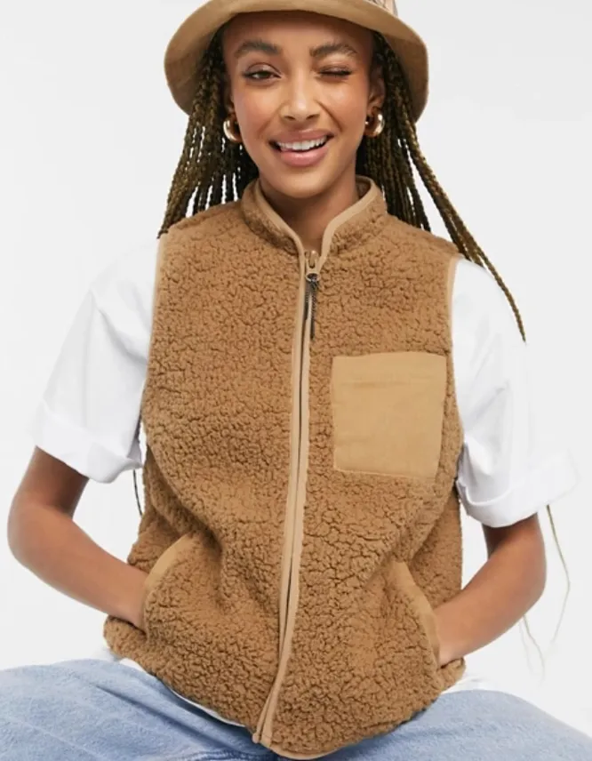 Бежевый жилет из искусственной овчины – универсальный вариант на каждый день. Он легко комбинируется с разными вещами и подходит под многие стили одежды. Чтобы собрать повседневный лук для прогулки, надевай жилетку поверх свитера и тонкой стеганой куртки. Дополни сочетание джинсами в винтажном стиле, высокими ботинками на шнуровке, кожаной панамой и лаконичной сумкой кросс-боди. В теплое время года жилетка будет стильно смотреться поверх оверсайз-худи и джинсовых курток.