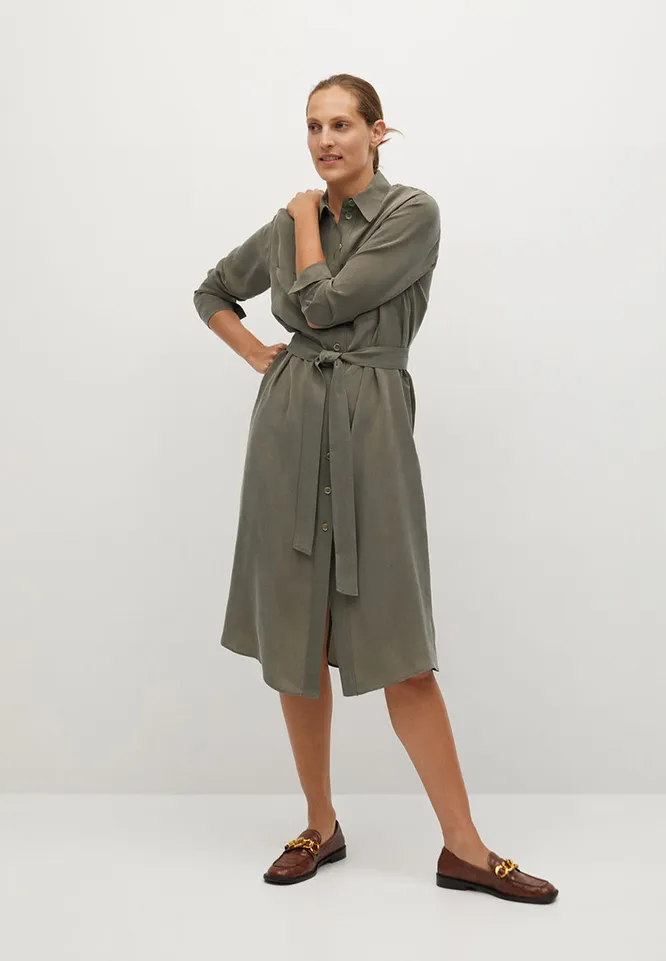 Что может быть более универсальной повседневной униформой, чем платье-рубашка. Мы выбрали модель приглушенного оттенка хаки длиной чуть ниже колена. Его можно носить и как платье, и как легкую накидку поверх водолазок, футболок, топов, рубашек. «Родной» ремень советуем сразу заменить на кожаный или любой другой, но не тканевый. Такое платье одинакового хорошо смотрится и с кроссовками, и с изящными туфлями и ботфортами, поэтому не бойся экспериментировать. Наш вариант аутфита на осенне-зимний сезон – водолазка + платье-рубашка + мужской пиджак и высокие сапоги.