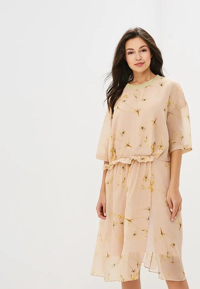 Воздушное платье с паттерном в виде полевых цветов понравится тем, кто любит свободные силуэты и базовую гамму цветов. Его ты сможешь носить в повседневной жизни с плотными коричневыми колготками и высокими жокейскими сапогами. Поверх можно накинуть уютный кардиган оверсайз или шерстяной пиджак в клетку. Отличным дополнением станут кожаная кросс-боди, бархатный ободок и серьги в форме цветов.