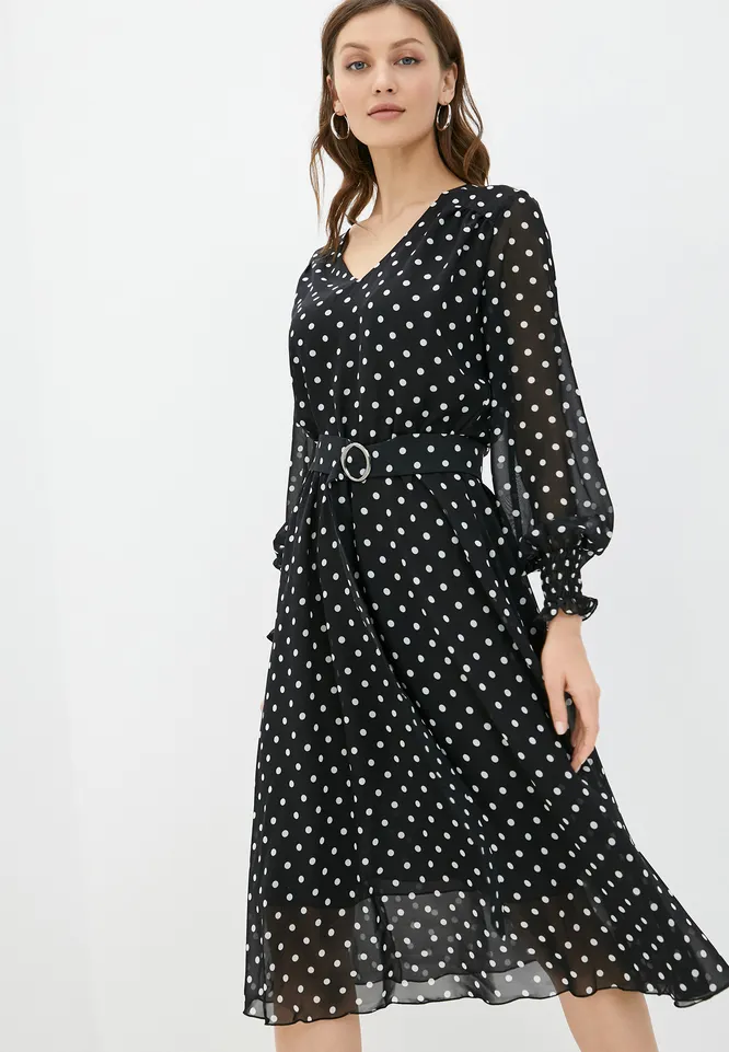 В составе этого черного платья в горох шелка – 50%, остальная часть – вискоза. Оно приятное, очень нежное и мягкое на ощупь. Объемные рукава с романтичными манжетами, летящая юбка, приталенный крой и вечно актуальный принт делают это платье универсальной вещью на долгие годы, в которую стоит вложиться. Рекомендуем носить его с черными ботфортами-чулками, ботфортами, облегающими щиколотку, классическими лодочками или лаконичными ботинками на шнуровке. В зависимости от случая «родной» ремень платья можно заменить на более яркий, чтобы еще больше подчеркнуть талию. V-образный вырез визуально удлиняет шею, подчеркивает ключицы, а также дает пространство для аккуратного кулона или эффектного ожерелья на шею.