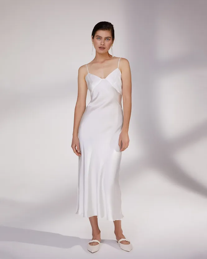 Белое шелковое платье-комбинация на бретельках – идеальный вариант для встречи 2021 года – года Белого Металлического Быка. Дополни его объемными серьгами, чокером в стразах и незамысловатым белым или серебристым клатчем из атласа – роскошный вечерний лук готов. Модель довольно универсальная, поэтому такое белое платье из шелка ты сможешь носить после новогодней ночи в повседневной жизни. В этом смысле отлично подойдет не только модель белого цвета, но и красного, синего или фисташкового. Трендовое сочетание – платье-комбинация в сочетании с пиджаком мужского кроя и грубыми ботинками или остроносыми ботильонами на каблуке-рюмке.