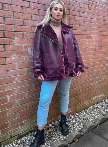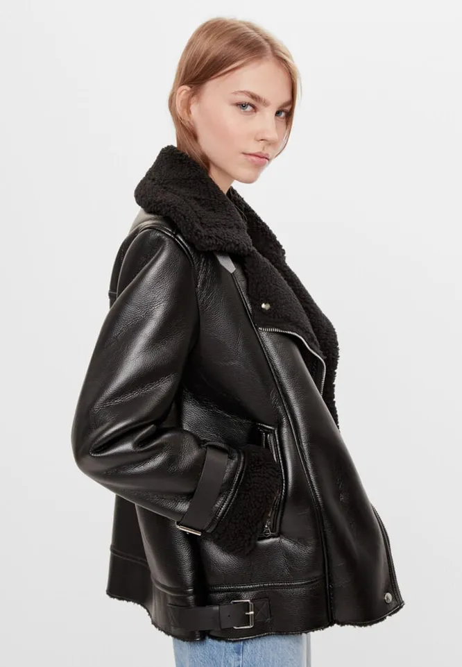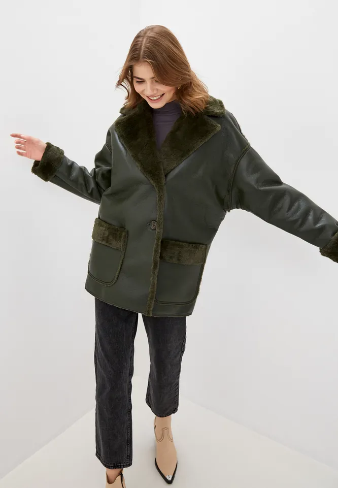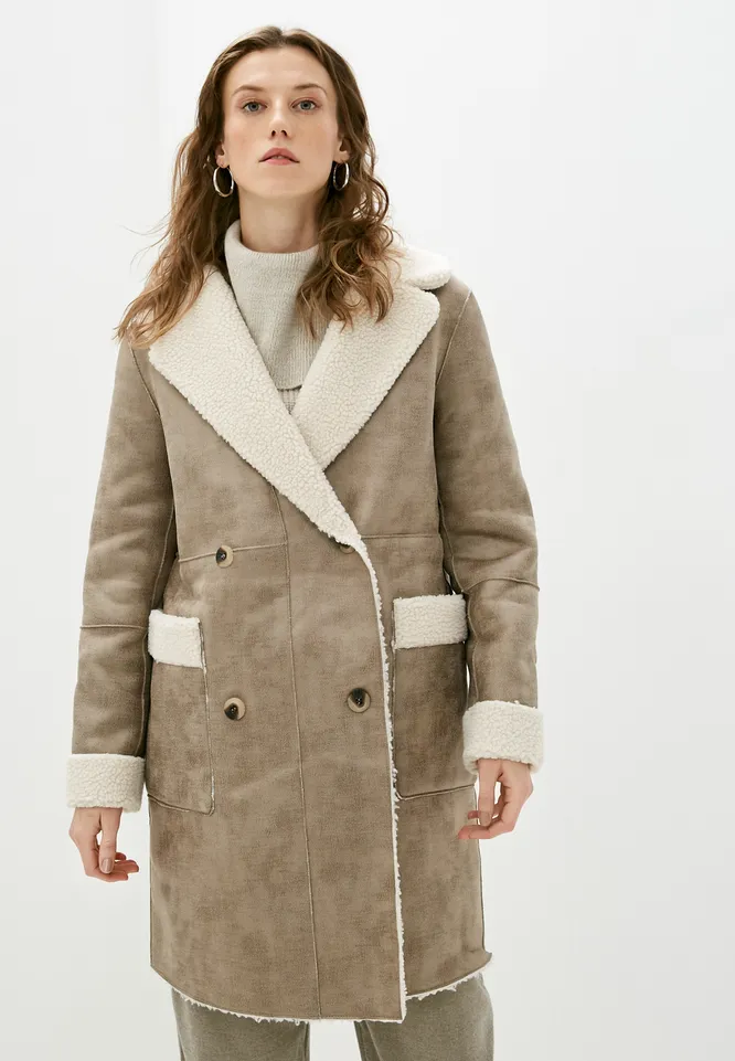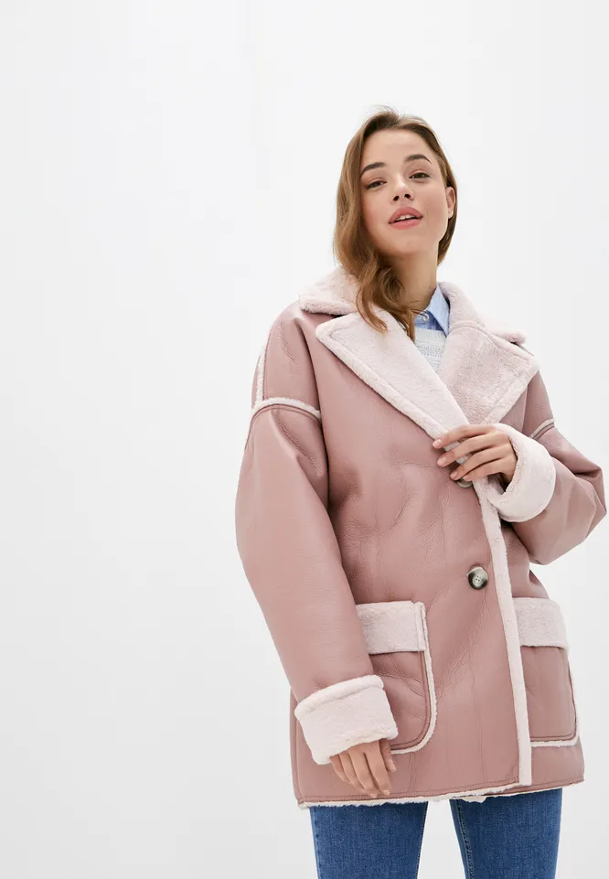 Если ты поклонница расслабленных силуэтов, обрати внимание на дубленку оверсайз с контрастным отложным воротником и большими накладными карманами. Поскольку дубленка бежевая, она не смотрится громоздко и не утяжеляет образ.
