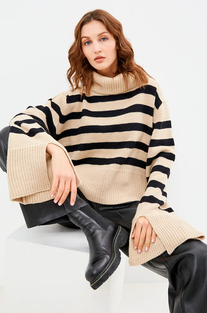 Если хочется чего-то необычного, обрати внимание на бежевый свитер с принтом. Самый модный вариант сезона — полоска. Следи за тем, как располагаются линии. Важно, чтобы они не были слишком частыми, а также выгодно акцентировали достоинства фигуры.