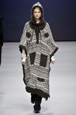 Силуэт облачен в парящие шифоновые сорочки и вязаные «коконы». Укрупненные прямоугольные формы накидок и блуз и удлиненные плащи привносят мужской акцент, в то время как абстрактные принты, напоминающие оперение птиц, выделяются на фоне естественной палитры из тонов темно-зеленого, горького шоколада, сизого и арктического синего.