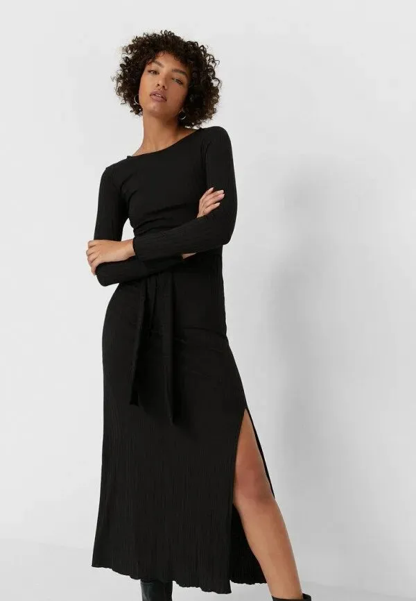 Просто не значит скучно. Эту простую истину доказал нам ауфит из длинного трикотажного платья с боковым разрезом и высоких грубых ботинок. К слову, и металлизированные босоножки тоже быстро «подружатся» с черным платьем.