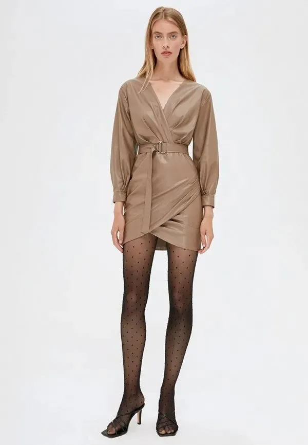 В новогоднюю ночь платье из искусственной кожи можно надеть с ажурными колготками и темными босоножками. Получится скромный и изящный образ.