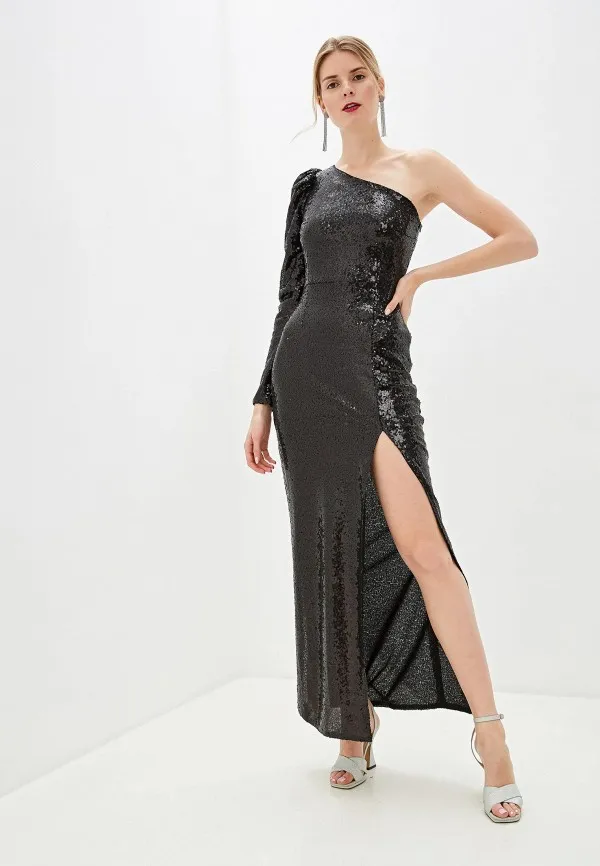 Элегантное черное блестящее платье с боковым разрезом — классический новогодний наряд, который ты сможешь примерить и с базовыми лодочками, и с трендовыми босоножками с квадратным носком.