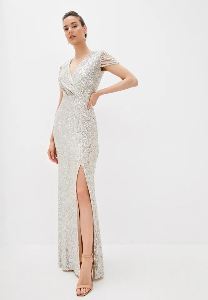 Длинное платье в пол — непрактичный, но безумно красивый вариант для новогодней вечеринки. Сочетай серебристый наряд с контрастными по цвету босоножками, например золотистыми.
