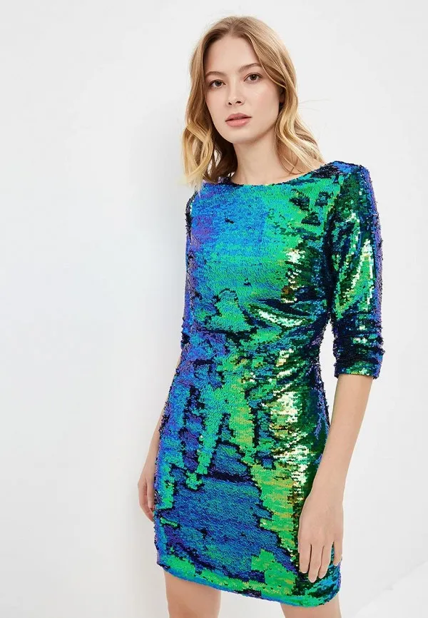 Платье из разноцветных пайеток можно носить и с элегантными туфлями, и с грубыми ботинками. Такое блестящее короткое платье сможет заменить тебе скучные черно-белые наряды, которые многие надевают на Новый год.