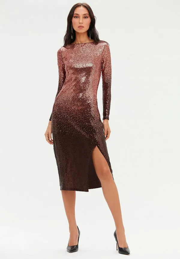 Блестящее миди-платье расцветки омбре однозначно выделится на фоне классических черно-белых нарядов. Комбинируй вещь с лаковыми лодочками или открытыми туфлями с квадратным носком.