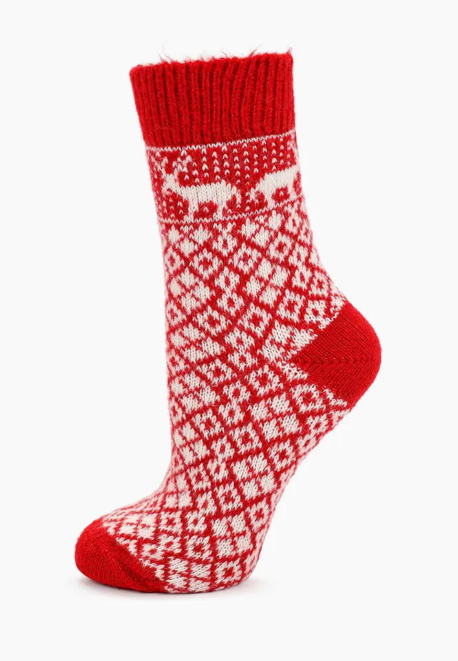 Теплые вязаные носки из овечьей шерсти украшены традиционным новогодним узором. Носи их с высокими сапогами или зимними ботинками в любых фасонах.