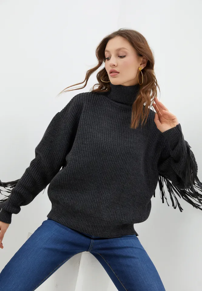 Бахрома стала одним из ключевых трендов текущего сезона. В дизайнерских коллекциях осени-зимы – 2020/21 были представлены вещи и аксессуары с бахромчатой отделкой, в том числе и свитеры. Мы подобрали для тебя черный свитер с высоким горлом, украшенный бахромой на спине и по всей длине рукавов. Такая простая и понятная, но в то же интересная вещь разбавит повседневные луки и придаст им шик. Носи свитер с джинсами или элегантными брюками каждый день, а если предстоит вечеринка, скомбинируй его с атласной юбкой в бельевом стиле и обувью на высоком каблуке.