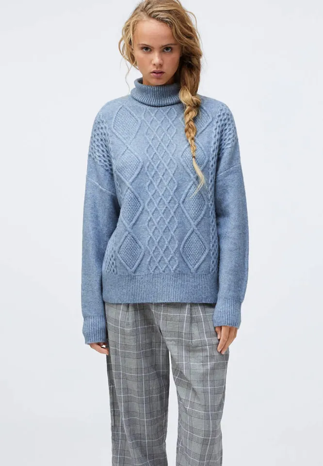 Добавь фактуру образу с помощью свитера с вязаными узорами в виде ромбов, кос, цветочных мотивов или орнаментов. Например, этот небесно-голубой свитер станет удачным дополнением к базовым джинсам или плиссированной юбке миди. Однако при покупке стоит помнить важный момент: узор на изделии не должен быть слишком объемным, иначе рискуешь визуально прибавить себе пару лишних килограммов.
