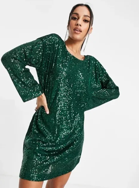 Идеальным нарядом для новогодней вечеринки станет короткое изумрудное платье с длинными рукавами, расшитое пайетками. Вещь сама по себе довольно нарядная, поэтому с аксессуарами мудрить не придется. Но если захочешь дополнить наряд, то выбирай аккуратные серьги, изысканное украшение для волос (заколку с камнями или тонкий декорированный ободок).