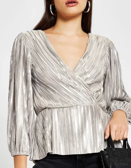Не хочешь пайетки – обрати внимание на серебристую плиссированную блузу с запахом. Она органично смотрится как с более сдержанным низом (например, с кожаными брюками), так и с нарядными вариантами вроде блестящей юбки с бахромой. Глубокий V-образный вырез позволяет надеть на шею кулон вытянутой формы или массивное многослойное колье.