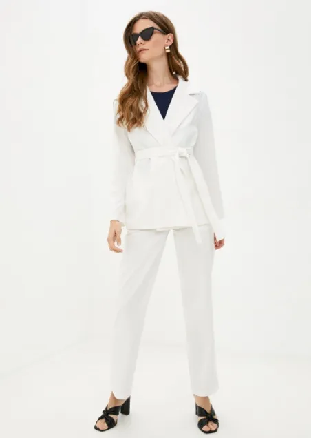 Белоснежный брючный костюм будет не только классным вариантом наряда, но и рациональной покупкой, потому что этот комплект ты сможешь носить и после Нового года в повседневной жизни. Идеальным дополнением к нему станут серебристые лодочки или ботильоны, массивные мерцающие украшения и пояс, который подчеркнет талию. Жакет можно надеть на голое тело или поверх контрастного топа (черного или зеленого, например).