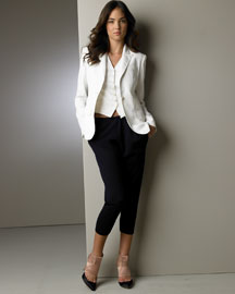 Хит круизной коллекции-2008 – белый жакет фрачного покроя в сочетании с белым же жилетом. Изящная классическая вещь может стать основой для любого ансамбля: с юбкой-футляром получается официальный наряд, с брюками – броский, но практичный, с широкой «этнической» юбкой с принтом – экстравагантный.