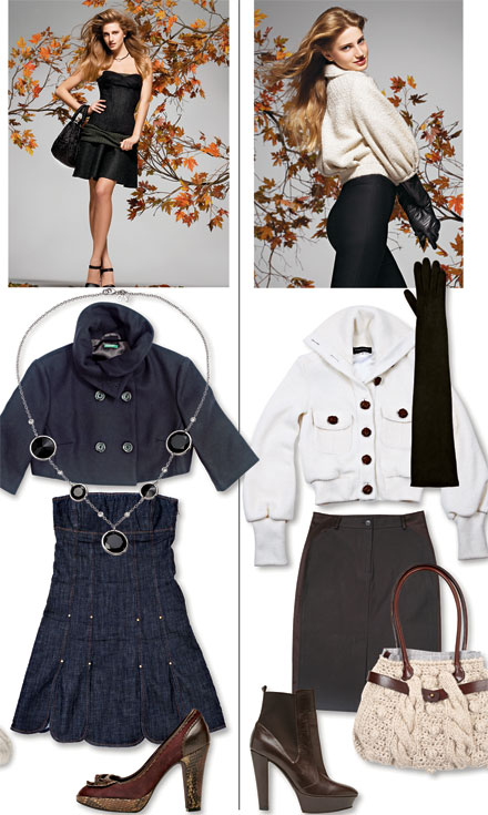 ![]() | 1. Жакет, Benetton; Украшение, Giorgio Visconti; Платье, Valentino Red; Туфли, Baldan; 2. Куртка, Patrizia Pepe; Перчатки, Sonia Rykiel; Юбка, Naf Naf; Ботильоны, Donna Karan; Сумка, Brunello Сucinelli; |