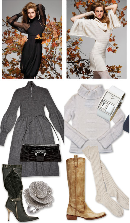 ![]() | 1. Платье, Brunello Cucinelli; Сумка, Mascotte; Кольцо, Giorgio Visconti; Сапоги, By Angels 2. Свитер, Rivamonti; Часы, Swarovski; Гольфы, Brunello Cucinelli; Сапоги, Liska |