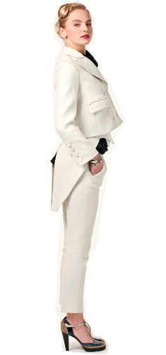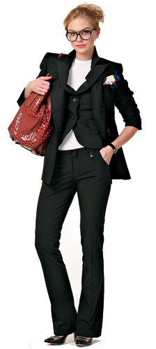 На вечерКостюм-тройка – комплект на все времена. Он смотрится настолько элегантно, что вполне справится с ролью вечернего туалета, нужно только добавить соответствующие аксессуары. Белый фрак – это безусловно вечерний вариант. На протяжении всей своей истории фрак не раз менял свой облик. На этот раз фалды перешли на жилет, а пиджак стал короче. Костюм-тройка, Sonia Rykiel, 73 530 руб. Топ, Thomas Wylde, 29 650 руб. Браслеты, Nomination, верхний – 6054 руб., нижний – 4571 руб. Туфли, Boss Orange, 12 654 руб. | ![]() |