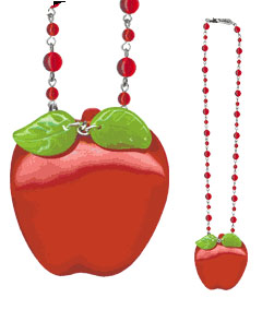 Красное блестящее яблочко с двумя нежными листиками будто только что сорвано с ветки. Возможно, автор этого чудного украшения, сделанного, кстати, вручную, вдохновился, глядя на настоящий плод. А ведь такую красоту жалко есть! И вот древнейший символ соблазна увековечен в ожерелье.