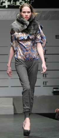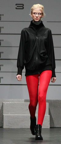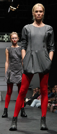 Первая часть осенне-зимней коллекции Юлии Калманович на RFW целиком было посвящено сочетанию красного и черного. Беспроигрышная, «вечная» комбинация менялась местами по вертикали – то красные колготки, с черными, короткими платьями, то наоборот. Конечно, попытка переосмысления отношений между двумя твердынями цветного стиля явно затмила все иные моменты показа, включая небольшой ролик, открывавший его. Но, к примеру, клетчатые фиолетовые пальто, которых в коллекции было несколько, наверняка, запали в душу большей части женской аудитории показа, как, впрочем, и узкие пиджаки с огромным декольте. Успешной надо признать и меховую часть коллекции. Не перегружая платья мехом, Калманович сделала его максимально заметным. Даже полностью меховые тулупы, были без рукавов. Третьим цветом показа был серый – его добычей стали плащи и большая часть аксессуаров.