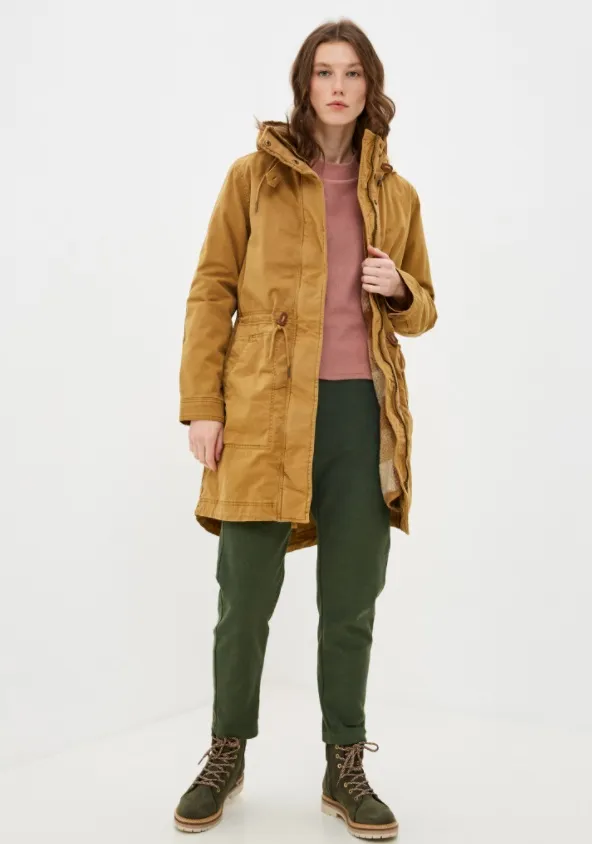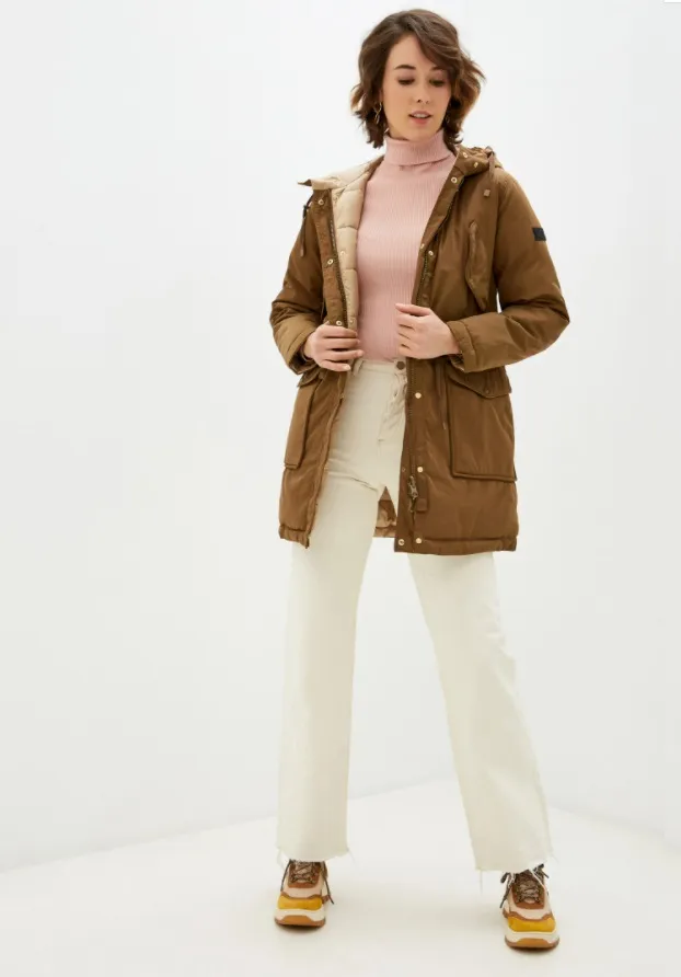 Тем, кто в холодное время года предпочитает носить яркую верхнюю одежду, предлагаем утепленную парку в насыщенном песочном оттенке, который не смотрится кричаще. Такая парка стильно смотрится с вещами в природной цветовой гамме. К примеру, ее можно носить с бордовыми брюками и коричневым джемпером, темно-зелеными джинсами и черным джемпером. Из аксессуаров с ней хорошо миксуются шапки и шарфы объемной вязки, а также аксессуары в спортивном стиле. Если ты часто ездишь за город или на горнолыжный склон, то также советуем присмотреться к этой модели.